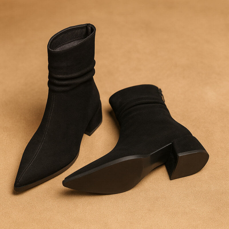 The Julia – Pointed Toe Boots combine everyday comfort with a sleek, flattering look. The pointed toe gives a longer, more refined silhouette, while the low block heel adds height without sacrificing stability. Soft suede and a slim ankle fit make them perfect for effortless wear from day to night.